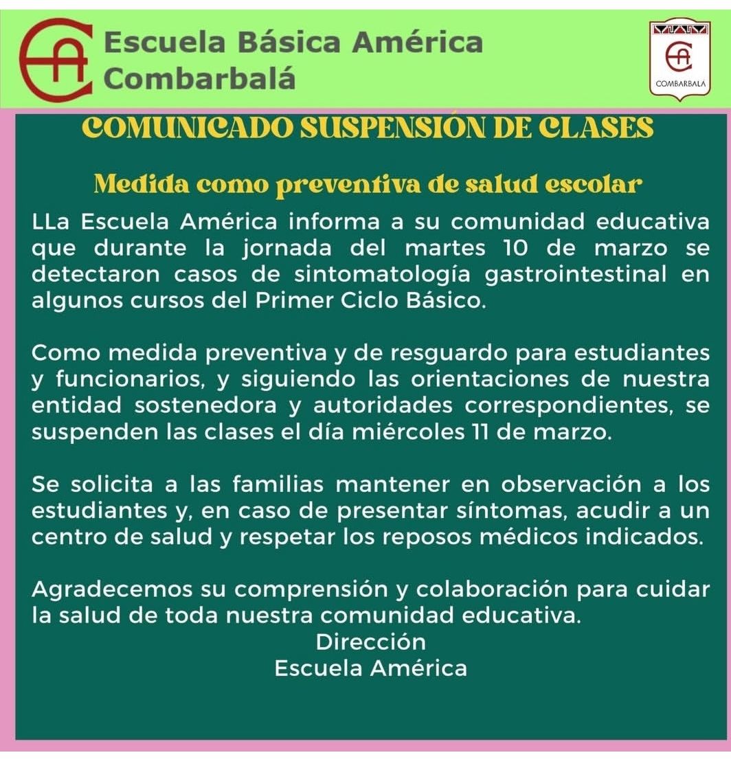La comunidad educativa de la Escuela América informó la suspensión preventiva de clases durante la jornada del miércoles 11 de marzo, luego de detectarse varios casos de sintomatología gastrointestinal entre estudiantes del primer ciclo básico.